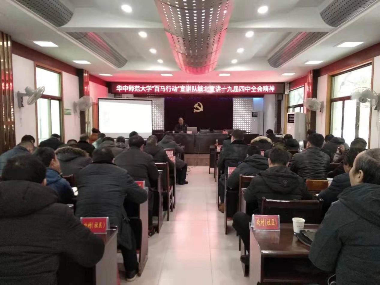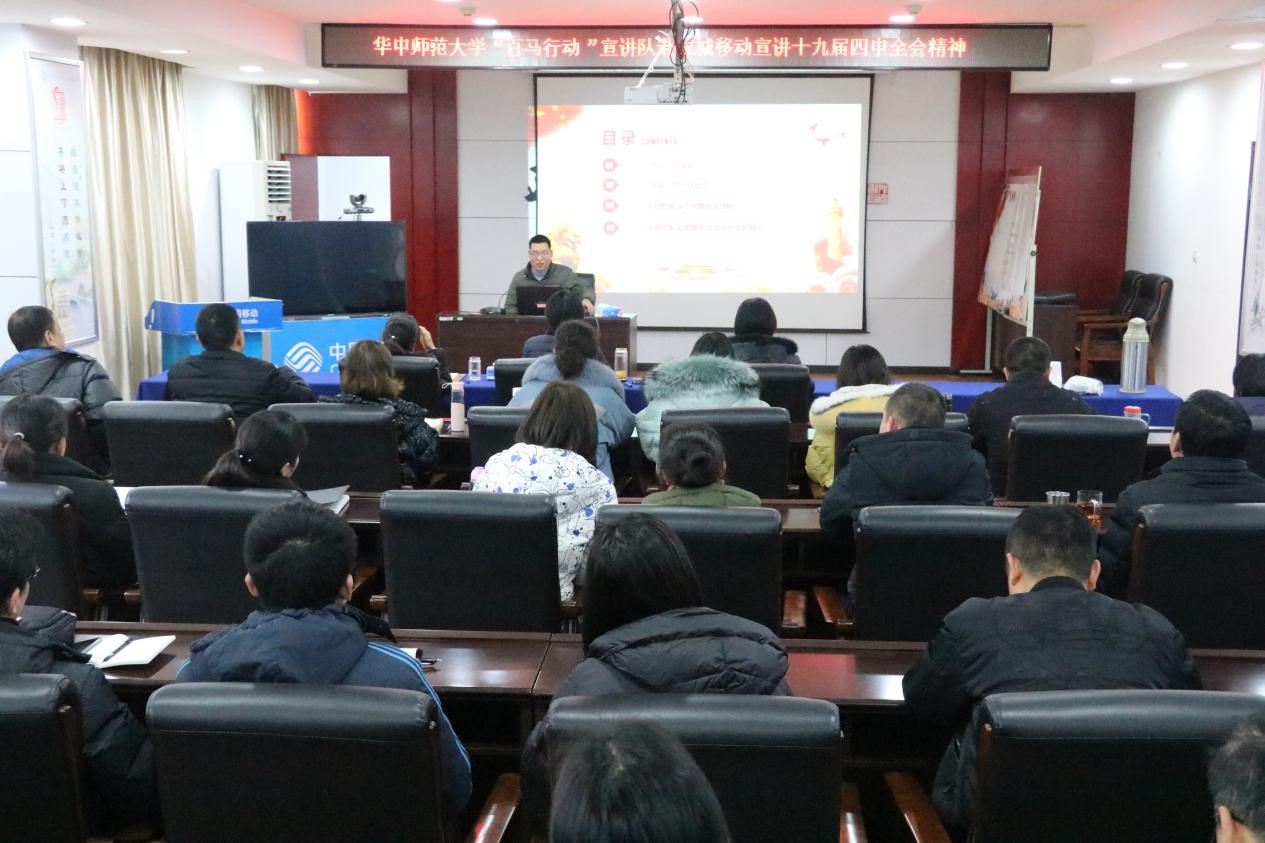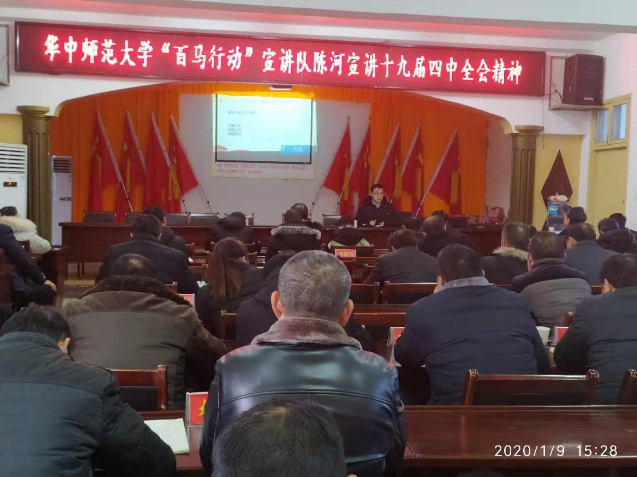 据了解,为贯彻落实中央和省委关于做好党的十九届四中全会精神宣讲工作的部署和要求,根据省委宣传部具体安排,组织百名高校专家学者开展“百马行动”,面向基层群众宣讲党的十九届四中全会精神。华中师范大学“百马行动”宣讲队组织数名马克思主义学者来到应城,分别到黄滩镇、陈河镇、城北街道办事处、城中街道办事处、应城移动分公司等地开展党的十九届四中全会精神宣讲。