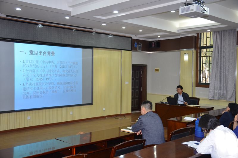 会上,纪检委员谭力同志从总体目标、必须坚持六项基本原则、四大政策支撑体系、健全三大脱贫攻坚机制等详细解读了《中共中央 国务院关于打赢脱贫攻坚战的决定》;组织委员王珏同志从总体要求、集中力量支持深度贫困地区脱贫攻坚、强化到村到户到人精准帮扶举措等方便详细解读《中共中央 国务院关于打赢脱贫攻坚战三年行动的指导意见》;宣传委员徐福刚同志从如何落实精准扶贫方略、加快贫困地区基础设施建设、加强精准扶贫组织领导等方面详细解读《中共湖北省委 湖北省人民政府关于贯彻实施<中共中央 国务院关于打赢脱贫攻坚战的决定>的意见》;青年委员马珺同志从为何首次开展中央脱贫攻坚专项巡视、脱贫攻坚专项巡视“专”在哪、为何选择湖北等方面详细解读“中央第二巡视组对湖北省开展脱贫攻坚专项巡视工作动员会”。