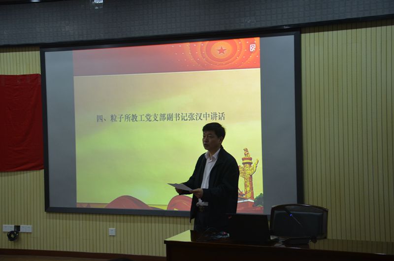 粒子所党支部副书记张汉中做了讲话。他认为,科研部党支部的科研业务是学校的重要工作,也是粒子所最重要工作之一。科研部具有熟悉科研工作业务、熟知科研发展规律、熟练科研服务技能的部门优势,希望在科研部党支部指导下,双方加强合作,进一步提升粒子所党员的科研能力和水平,促进物理学科的提升和发展。