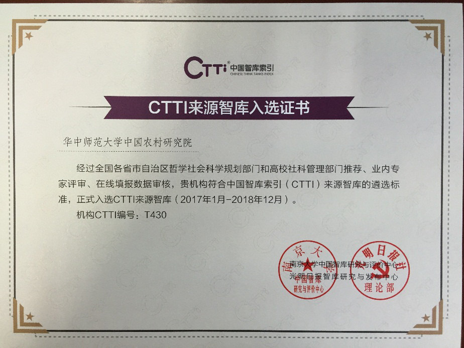 2016年12月17日,由光明日报社、南京大学主办,光明日报智库研究与发布中心、南京大学中国智库研究与评价中心承办的2016中国智库治理论坛在南京大学举行。同时,会上发布了中国智库索引(CTTI)的首批入选智库名录及效能测评报告。教育部人文社会科学重点研究基地——中国农村研究院成功入选首批中国智库索引(CTTI)来源智库。